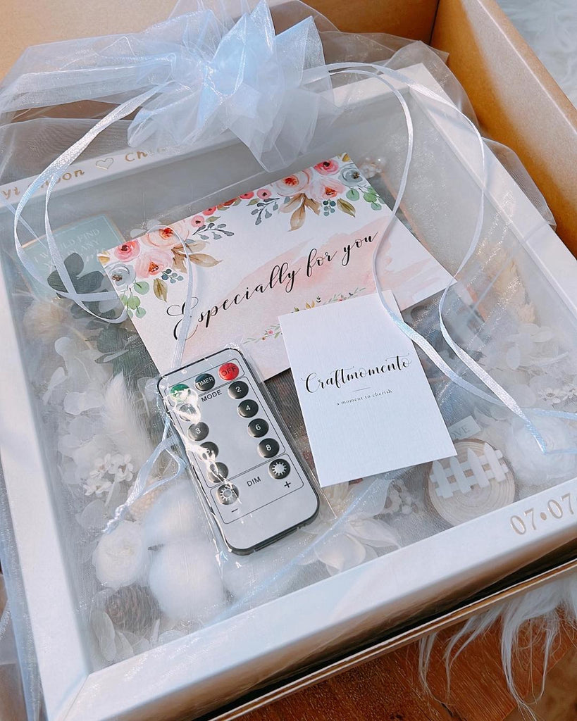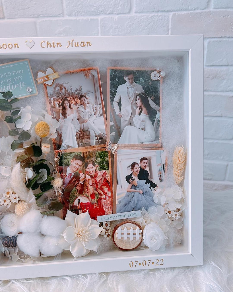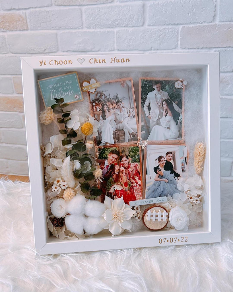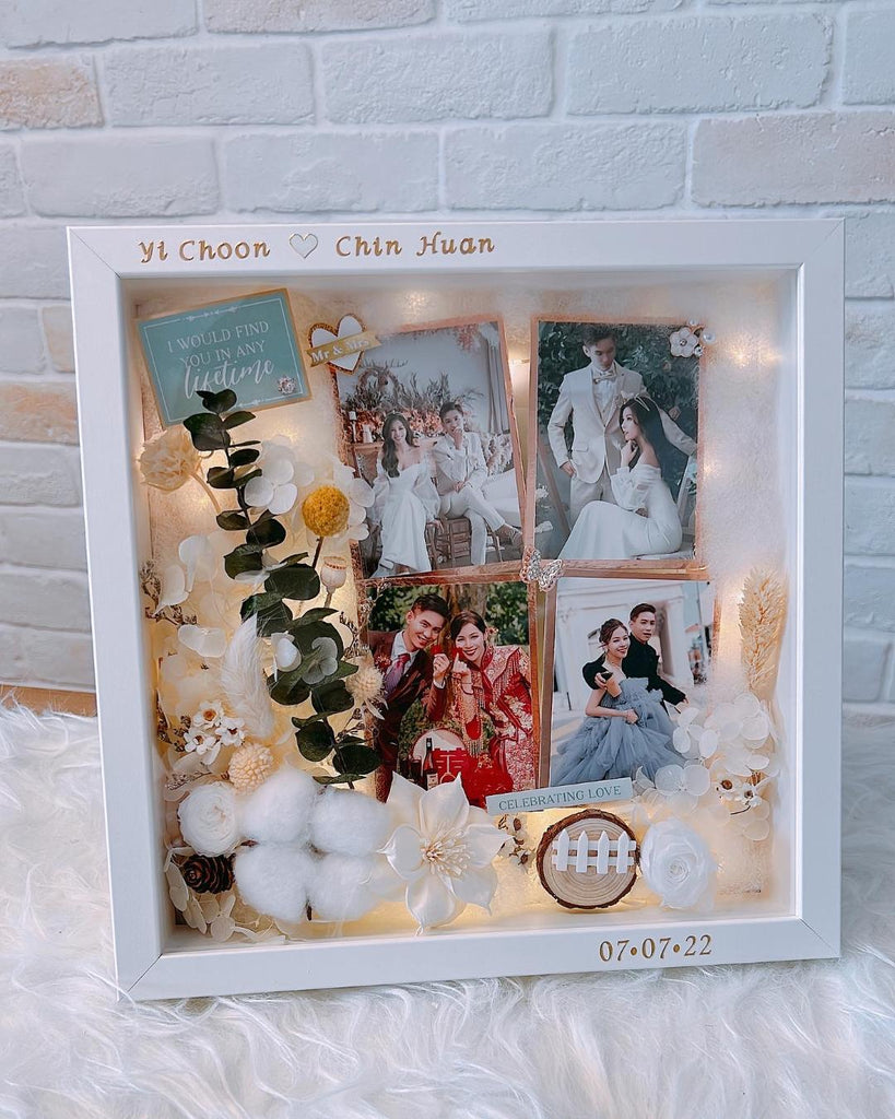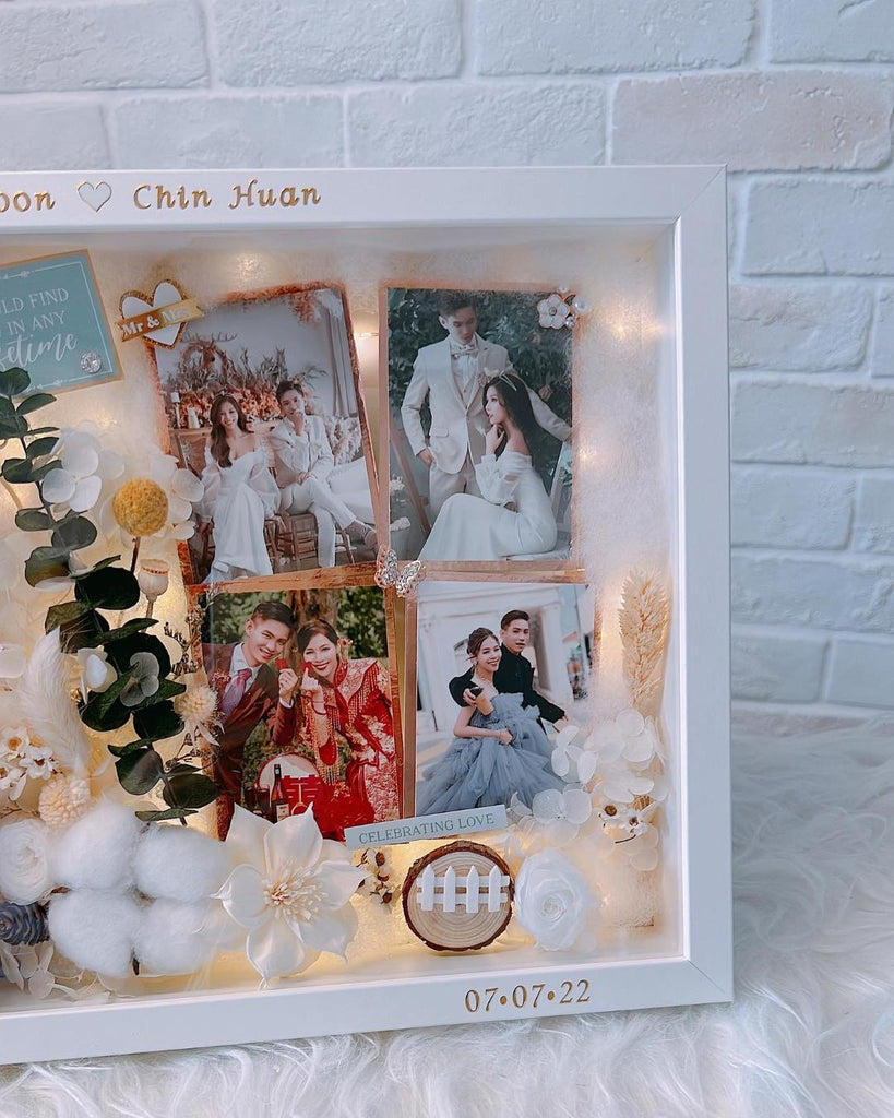 - Customised with 4 pieces of couple photo and preserved flowers.